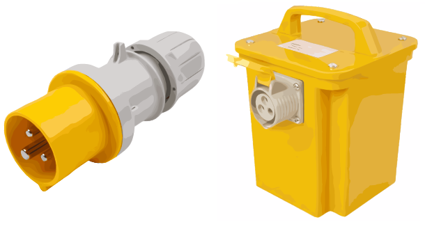 used on construction sites. 110v appliances are usually connected via yellow industrial plugs and sockets.